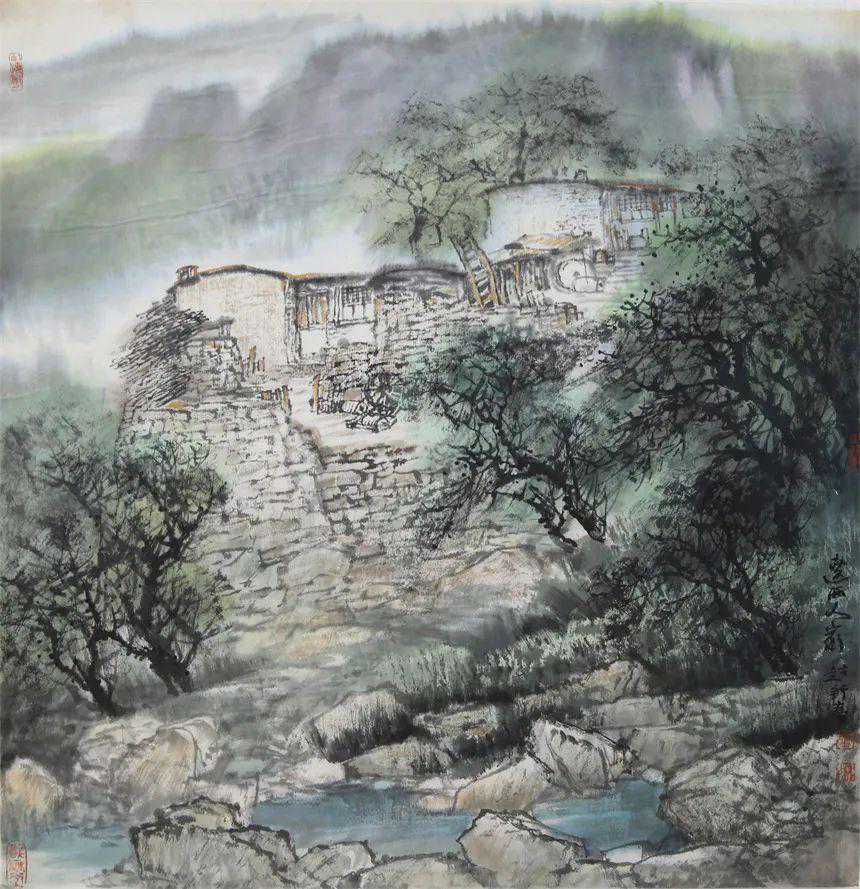 赵舒春山水画多取“全景式”“边角式”构图,构图饱满,严谨细腻,张力十足。“九朽一罢”(宋·邓椿《画继·三·岩穴上士》)是常挂在他嘴边的一句话,意即绘画构图要起稿九次,到了第十次才能画成,绝对不能凭借偶然的兴会,一挥即就,要仔细斟酌,反复推敲,来不得一丝的投机与取巧,因而,其画面逻辑缜密,层次清晰,宾主分明,虚实呼应,意境悠远,极有带入感和纵深感,可观、可游、可居、可感、可知,完全是辽西山水的翻版和辽西场景的再现。赵舒春善于“计白当黑”,以无画有,以虚破实,把中国的哲学意味寓于画面当中,体现睿智,显露慧心,这些虚实相生的“留白”,往往起着举足轻重的“活眼”作用,使满塞的画面气脉贯通,气韵生动,意蕴悠长。观赏赵舒春画作,无论是行走的流云,浮动的薄雾,还是潺潺的流水,浅浅的河床,他皆以“留白”处之,不拘一格,匠心独运。赵舒春选取描摹物象全从立意出发,由于布置得法,经营得当,多不嫌满,少不嫌稀,气势逼人而又温馨可人,气象宏大而又惟妙惟肖,尤其是对具体物象的描绘:错落的平圆顶民居、不规整的篱笆院落、蚀旧的石碾石磨、堆积的秸秆垛、提水的老井、耕种的老牛、质朴的村姑,等等,他常常攫取这些日常生活中的元素,以点带面凸显出典型环境中的典型人和事,让人感到可信可亲,仿佛我们就置身于这样的生活场景当中,平添了一种人情味和亲和力。