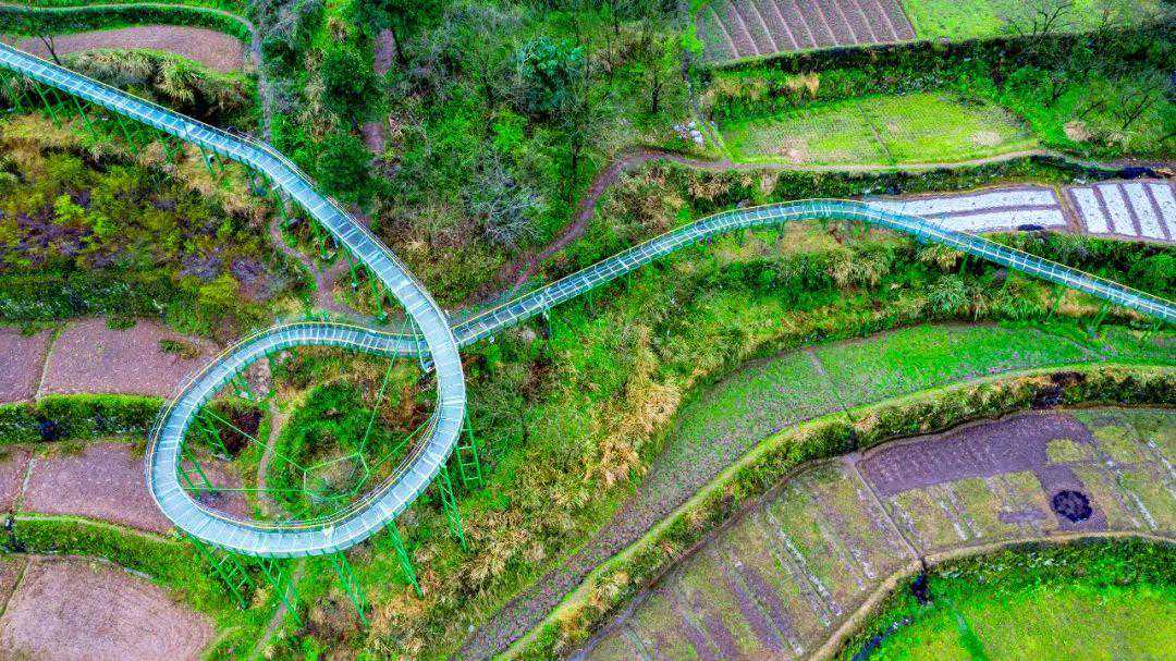 全长1888米、落差160米、时速30码!斑竹村的这条玻璃滑道由全透明的钢化玻璃打造而成,似一条碧蓝色的天河挂在于梯田之间。沿着环形滑道顺流而下,在空中急速穿梭,水花四溅,气势磅礴。在这里,现实版的速度与激情玩的就是心跳!