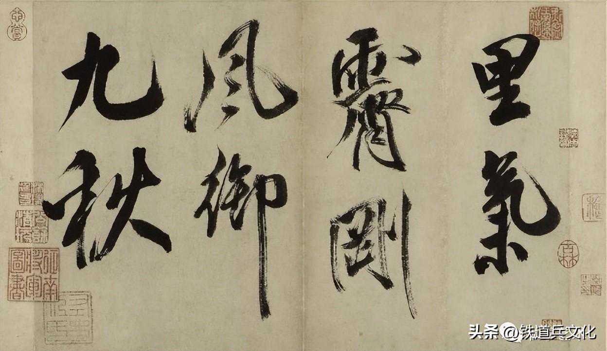 当然,《多景楼诗帖》优点还不仅仅限于豪迈上,透过作品形式风格的表层,还可体味到其中所熔冶的历代书家之优长,如钟王的清润、欧虞的简净和颜柳的端严等。这些书法大家们的神韵气息,与米芾特有的“刷”相摩相荡,相互生发,化合为整体气韵中的风格元素,充分体现了米芾“只应酿蜜不留花”和其熔铸百家、“集诸长处,总而成之”而自成面目的创作理念和艺术本领,也体现了宋人的“尚意”书风和米芾“刷”字的丰富内涵。这是他遍临百家“集古字”所打下的深厚功力所使然。