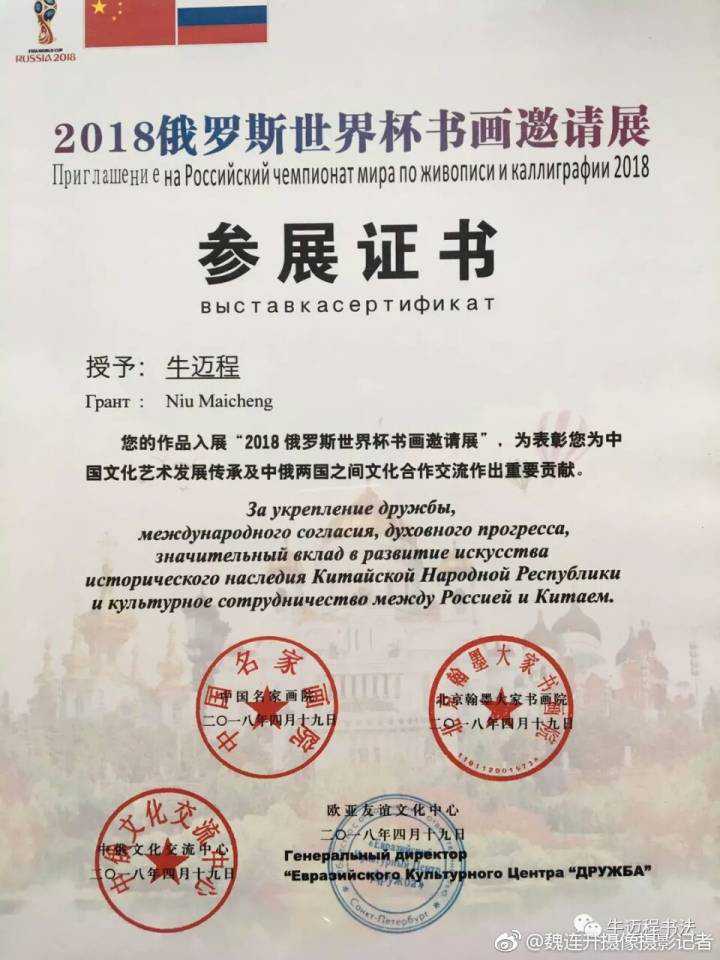 著名书法家牛迈程受邀参加了“2018俄罗斯世界杯书画邀请展”,并获“中俄艺术金球奖”。