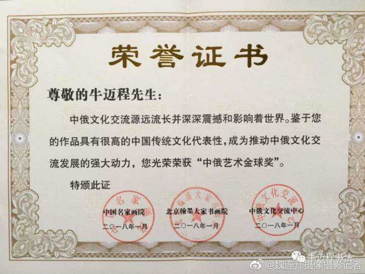 经文化部门、媒体和社团单位共同推荐,在18652名艺术家当中,经过初评、复评和终评,书法家牛迈程光荣荣获“中俄艺术金球奖”,获奖的艺术家当中,中国艺术家与俄罗斯艺术家各十位,评委会为获奖艺术家颁发了获奖证书、奖杯。