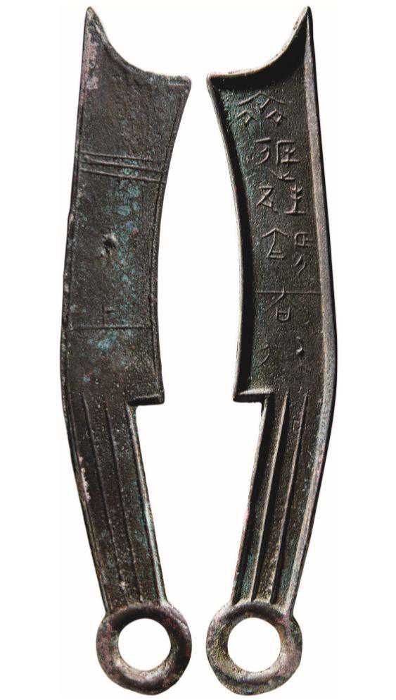 长期以来,别称“齐鲁”的山东仿佛只有齐刀一位“形象大使”。此图即为六字刀,被钱币学界认为是田齐开国的纪念币。齐国本来是姜姓诸侯国,后来田氏逐渐强大,于公元前379年取代了姜姓政权,历史上称之为“田氏代齐”事件。田氏为了庆祝这一重大事件,铸造了精美的货币,并镌刻铭文“齐返邦长大刀”六字以纪念之。由此,六字刀成为了我国最早的金属纪念币。