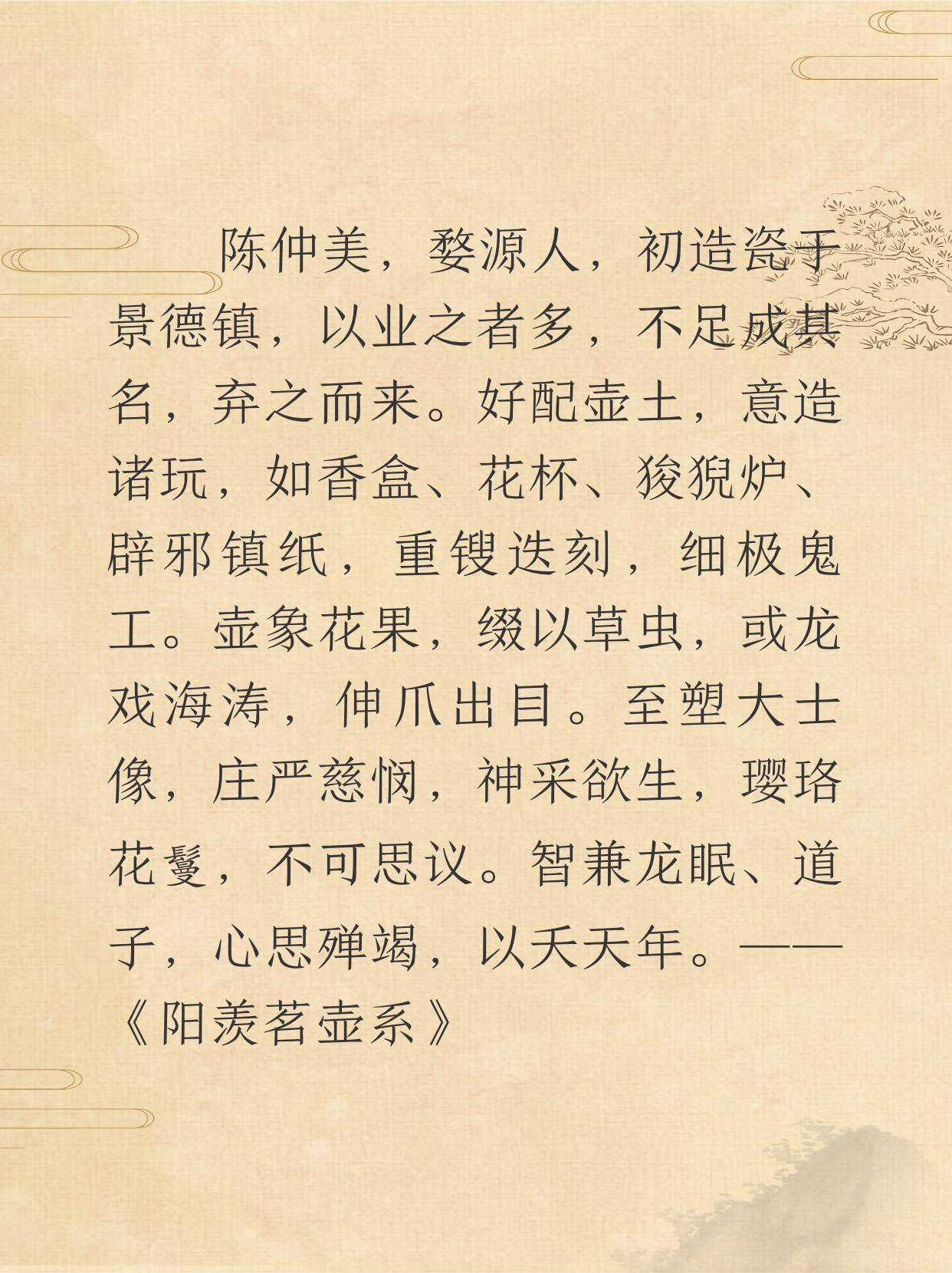 陈仲美,婺源人,起初,在景德镇制作瓷器,因为从业的人很多,他很难成名,于是就放弃作瓷器来到宜兴鼎蜀镇。陈仲美喜好配制紫砂壶土,制造各种把玩物,如香盒、花杯、狮子炉、辟邪镇纸,这些把玩物雕刻繁缛,精工细丽。紫砂壶仿生像花果,点缀以草虫,或者像龙戏海涛,张牙舞爪。至于塑观音大士像,庄严慈悲,神采栩栩如生,璎珞花鬘,不可思议。陈仲美有李公麟、吴道子的艺术才华,但他殚心竭虑,而英年早逝。