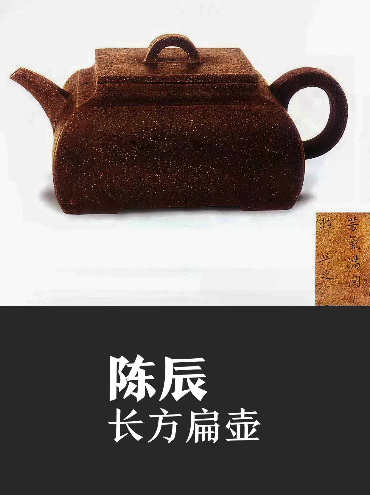 陈辰,字共之,善于镌刻紫砂壶的款识,附近许多人都请他代为刻款,在作陶人群体中是一位书法家。在紫砂壶上镌刻款识,时大彬当初请会写书法的人写下墨迹,自己用竹刀刻画,或者是以印章拓印。后来竟然自己可以运刀写字,书法效果非常闲雅,有王羲之《黄庭经》、《乐毅论》的书法笔意,别人不能模仿,鉴赏家以书法款式把时大彬与其他人区别开来。其次是李仲芳,也能落款书法。李茂林,只能用朱笔书写记号而已。李仲芳有时也代时大彬刻款,但是手法上稍逊。模仿名壶称之为“临”,相当于书画家刚入门时一样。紫砂陶界称:“做壶的高手有三大。”说的就是时大彬、李大仲芳、徐大友泉。我送一句话:“明代作陶的好手众多,以时大彬水平最高,这不是虚谈。