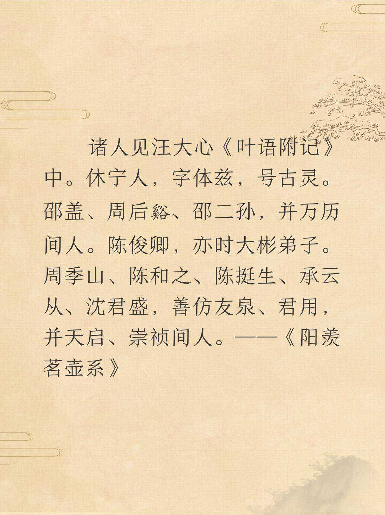 别派人物在汪大心《叶语附记》中可查到。汪大心,休宁人,字体兹,号古灵。邵盖、周后谿、邵二孙都是万历年间人。陈俊卿也是时大彬的弟子。周季山、陈和之、陈挺生、承云从、沈君盛,擅长模仿徐友泉、沈君用的壶艺,他们都是天启、崇祯年间人。