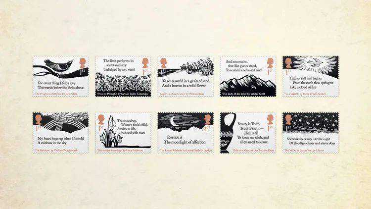 2020年是威廉·华兹华斯诞辰250周年的纪念。这套十枚邮票还展示了其他九名浪漫主义诗人的作品,其中包括济慈、玛丽·鲁滨逊等。