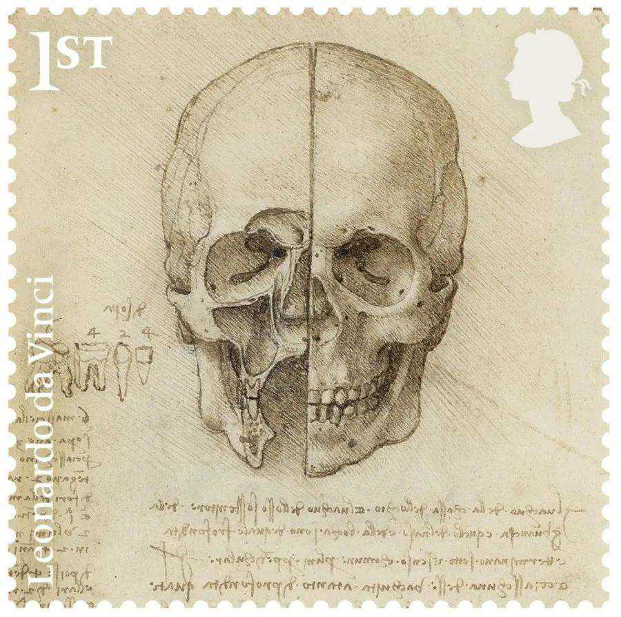 该系列邮票中描绘了几件著名作品,如骷髅(Theskullsectioned,1489年),达芬奇展示了从中间锯下的头骨,精美清晰的呈现头骨的比例和感觉神经的路径;丽达的头部习作(TheheadofLeda,1505-08),这幅画也是达芬奇画作中价值最高的一件。在其他的邮票中皆能看见达芬奇对骷髅、关节与猫的细节研究。