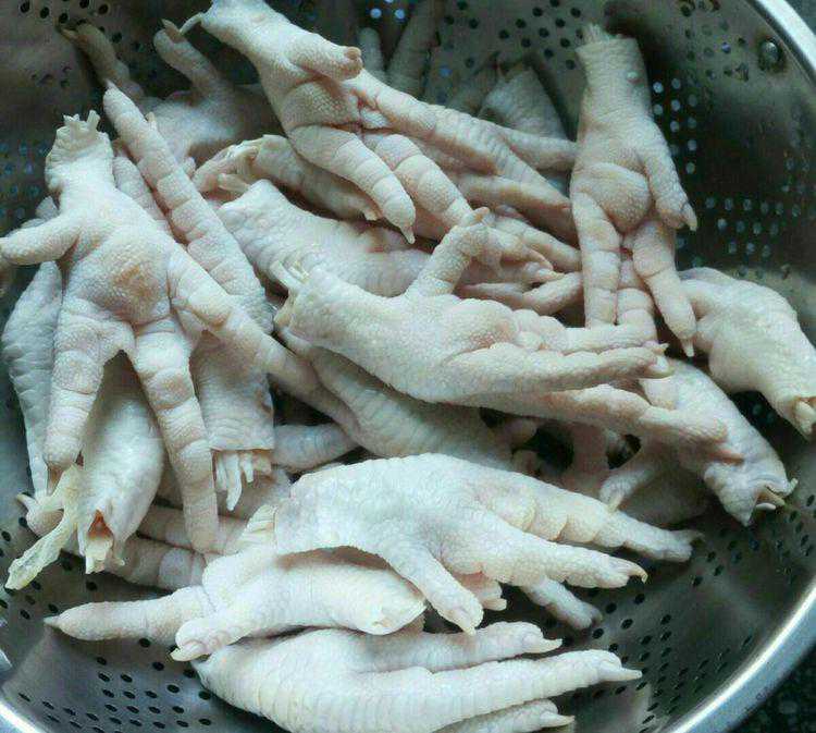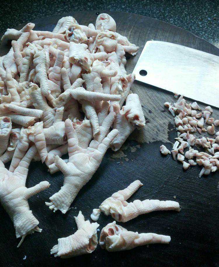 去鸡爪指,每个鸡爪剖切两刀成三块。