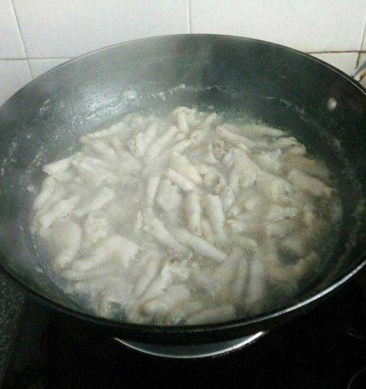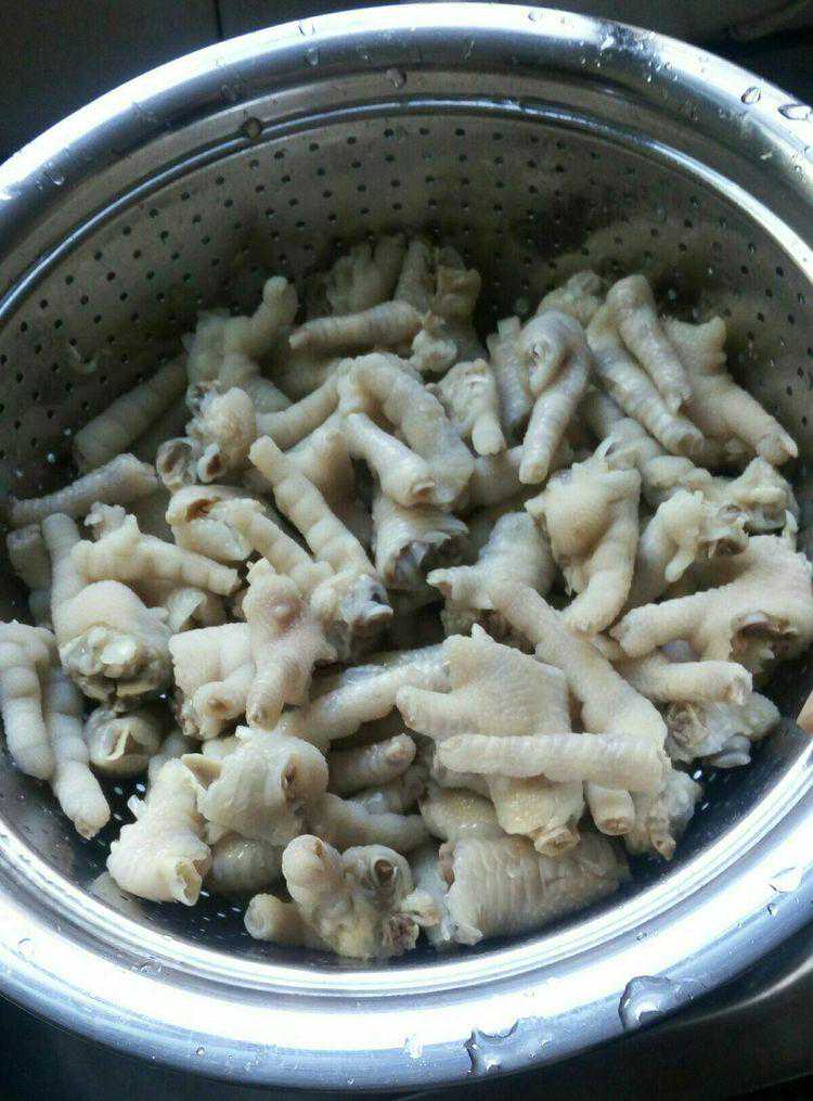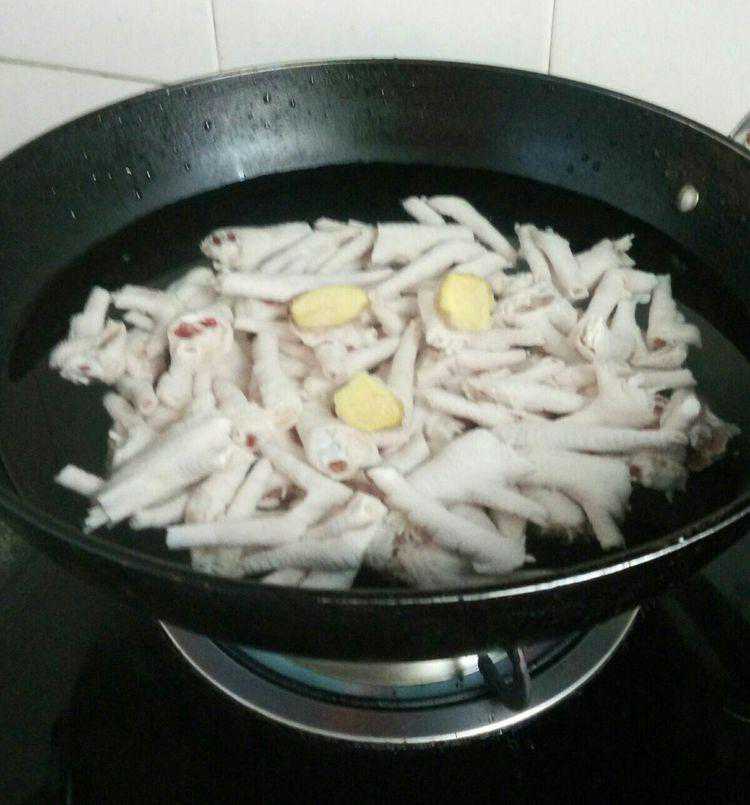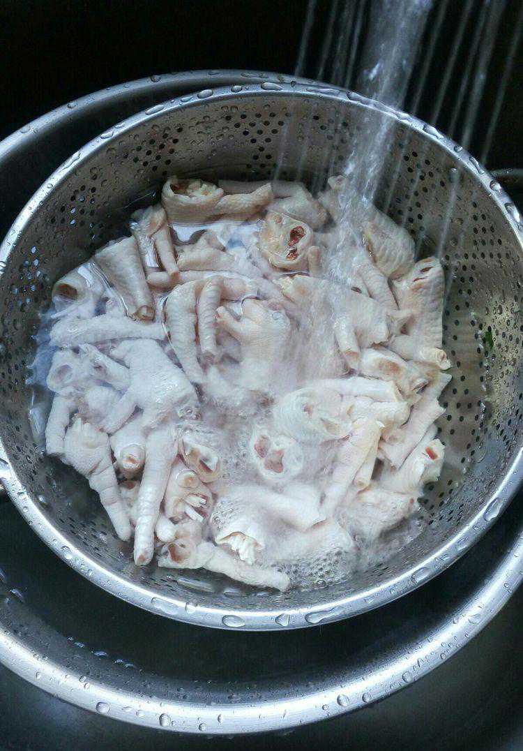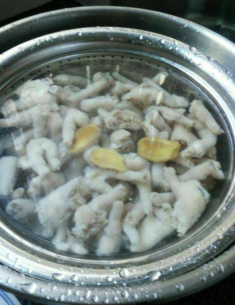 再用清水浸泡二十分钟(去掉三片姜),起鸡爪更紧致的作用,口感更佳。