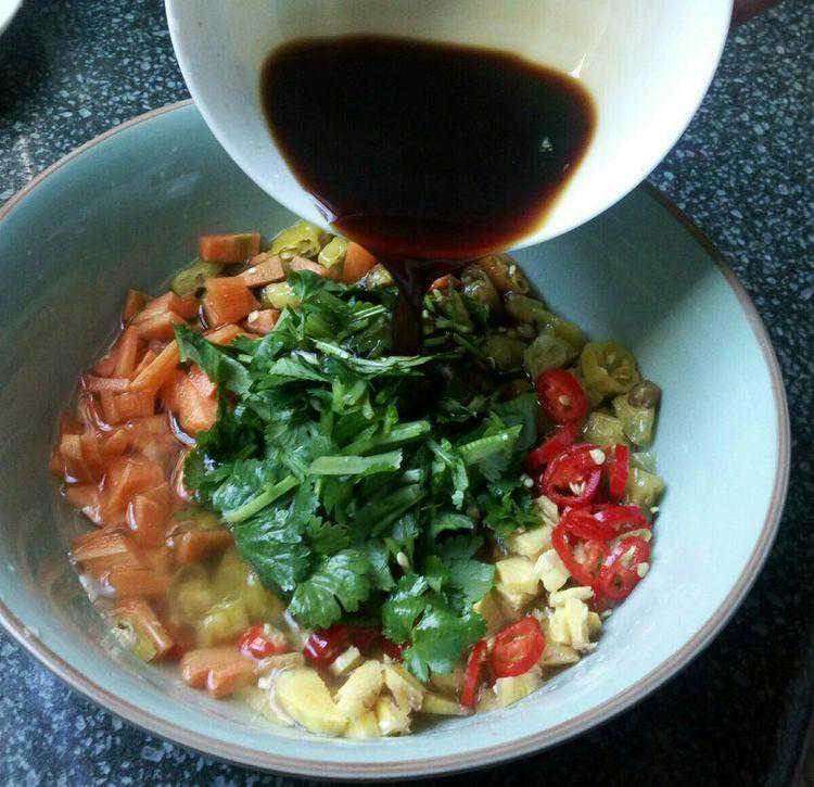 配料:泡淑2小包(100g一包)、香菜3―5根、红萝卜适量、红辣椒1只、姜一小块。