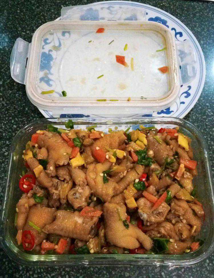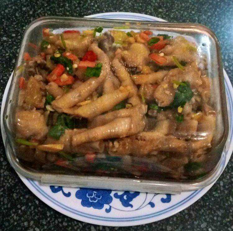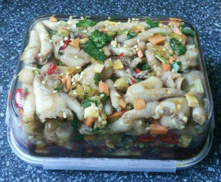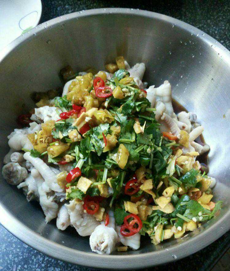把鸡爪,调好的酱醋香料汁倒入盆中。