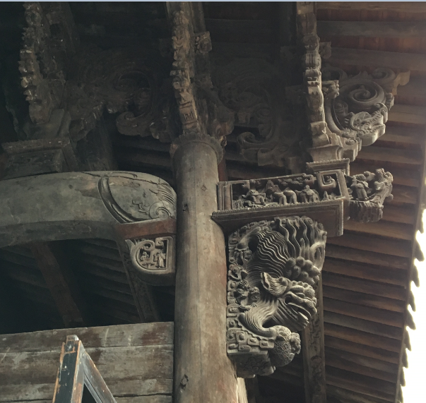 古代木雕工艺广泛应用于建筑中的“牛腿”、琴仿、梁柱、斗拱、门窗、挂落、雀替、飞檐、木雕挑头、过梁雕、栏杆的装饰雕刻上。