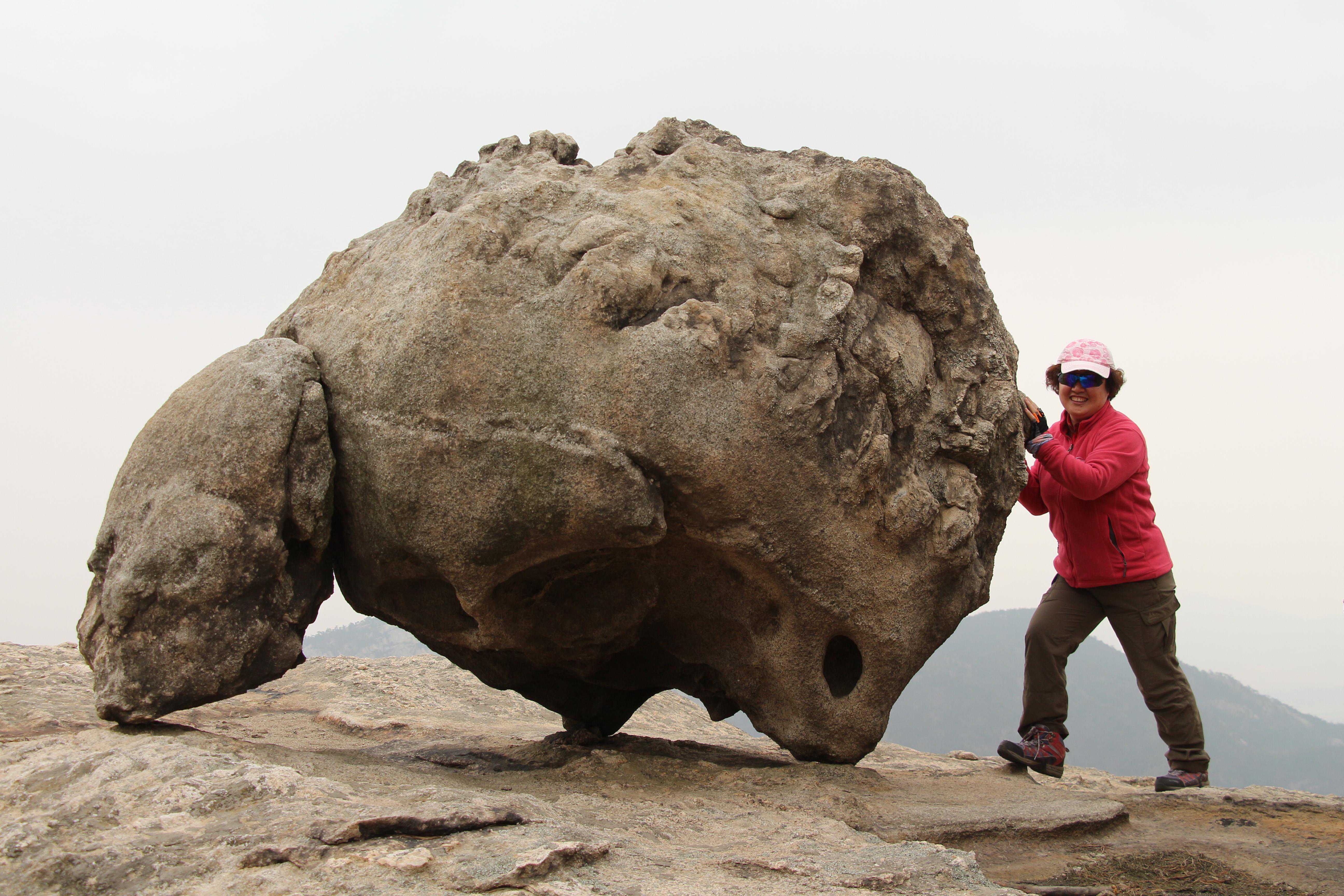 急速爬上了山顶,被眼前的这块巨石镇住了:它独自站在平坦的岩面上,似一尊巨大的石兽。真让人不得不叹服大自然鬼斧神工的惊人能力。