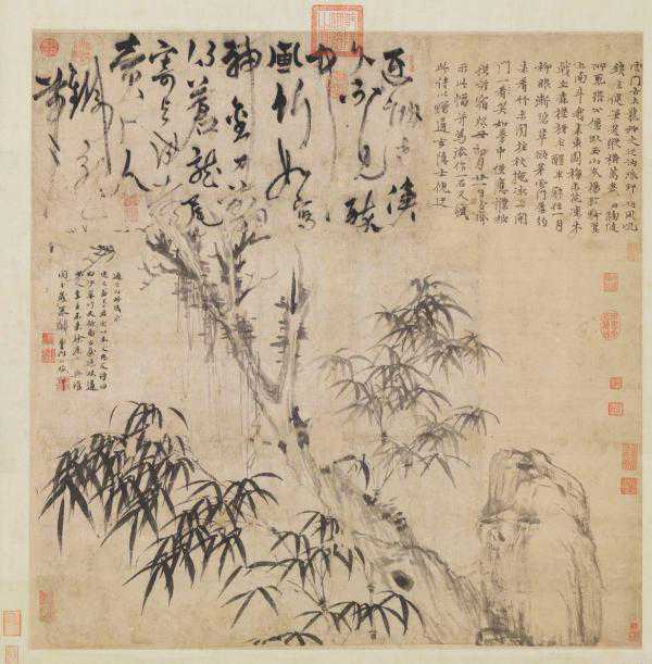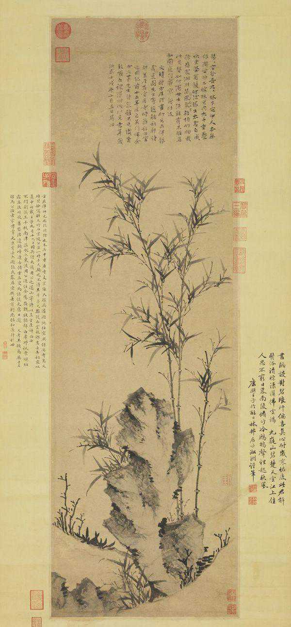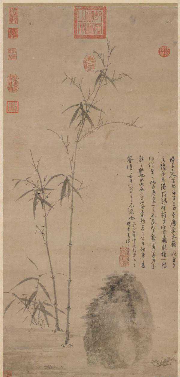 元初画竹名家如高克恭、赵孟頫、李衎等人都曾受到王庭筠直接影响。高克恭,字彦敬,学黄华墨竹,宗米氏云山,在元初画坛有重要影响。其所作《墨竹坡石图》是一幅典型的元代文人墨竹画。图绘秀石一块,竹二株生于石后,一浓一淡,笔法沉厚挺劲,墨气清润,结构谨严。竹叶自然下垂,生动地写出了竹子在烟雨中挺秀潇洒的姿态。画幅左下方高氏自识:“克恭为子敬作。”钤“彦敬”印。右侧钤“清父之印”、“顾氏珍玩”、“吴景旭印”、“仁山鉴定”等鉴藏印6方。“子敬”为元初著名学者、书法家龚璛。画面右侧中部有赵孟頫题诗一则:“高侯落笔有生意,玉立两竿烟雨中。天下几人能解此,萧萧寒碧起秋风。子昂题。”下钤“赵子昂氏”印。从题诗中可看出赵氏对高克恭的墨竹极为推崇,而高氏对自己的墨竹也自视颇高,尝自谓:“子昂写竹,神而不似;仲宾(李衎)写竹,似而不神,其神而似者,吾之两此君也。”