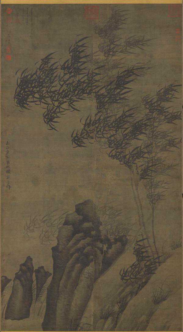 台北故宫博物院也藏有几幅顾安的墨竹图,其中《平安磐石图》写迎面竹三枝,枝叶风翻,有摇曳之态。竹下坡石,新泉漱于石罅,石后以澹墨作风叶数梢,以衬溟濛雾气。盖写山雨方酣,劲风剽疾之景,而极得其神者也。