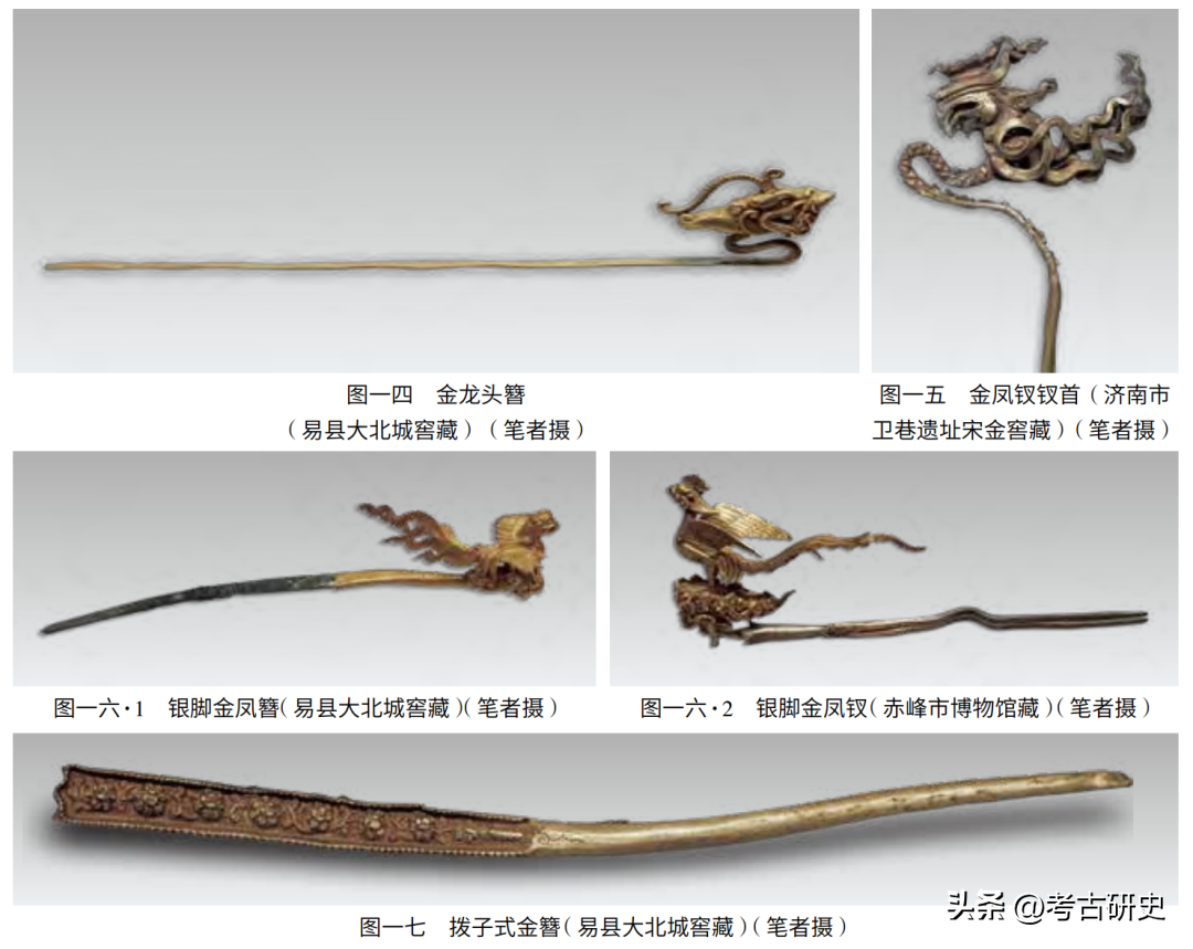 (二)簪。金龙头簪一枝,簪首龙头口衔宝珠,龙鬣飞卷,龙身细细满布鳞甲,虽与龙头比例悬殊,却是以两番夸张的弯折助成金龙破浪穿云之势(图一四)。济南市卫巷遗址宋金窖藏金凤钗钗头凤的设计构思与此相似(图一五)。银脚金凤簪一枝可与赤峰市博物馆藏一枝对看,二者题材相同,风姿一致,但细节处理仍有诸多不同(图一六·1、2)。拨子式金簪一枝,装饰部分两侧及顶端向下翻折,簪表折痕处錾作连珠,遂成装饰框,框内布鱼子地,其上打作缠枝牡丹,下方锥点一缕卷云(图一七)。银鎏金花头簪五枝(图一八),形制相同,不过簪首花朵大小不等,簪脚细粗有异、长短稍别(10.7~12.4厘米)。拨子式簪与花头簪,都是宋代金银簪子的式样,只是今所见多为南宋物,由此可知其流行当更早。