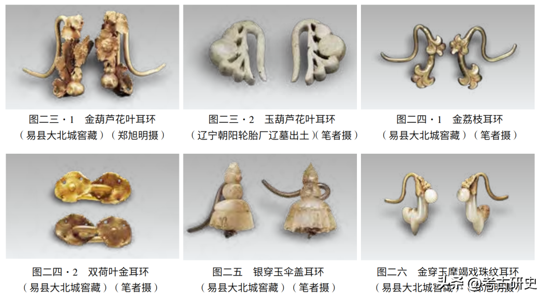 (四)耳环。窖藏中的几对耳环式样都很别致。一对金葫芦花叶耳环是象生的做法,随轻风而微动的叶子,绽放的花朵和花朵下垂着的小葫芦分别制作,然后攒聚成型(图二三·1)。辽宁朝阳轮胎厂辽墓出土玉葫芦花叶耳环与此相似(图二三·2)。又有金荔枝耳环一对(图二四·1)、双荷叶金耳环一对(图二四·2),都是铸造而成。银穿玉伞盖耳环一对,伞顶莲苞,下为覆莲,缘边碾琢一周沥水(图二五)。金穿玉摩竭戏珠耳环一对为白玉琢出“简化版”的摩竭戏珠,稍见辽代风格,上方的金穿耳部分是一束花叶上的一只蜻蜓,却又是宋风(图二六)。一对金包青金石慈姑叶式耳环,包镶所用金片是镂空作的花叶,耳环造型则取自莲塘小景中的慈姑叶(图二七)。宣化辽张匡正墓前室壁画中的奉茶女侍戴着的便是慈姑叶耳环[5](图二八)。