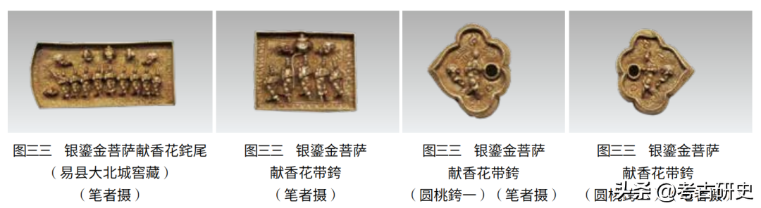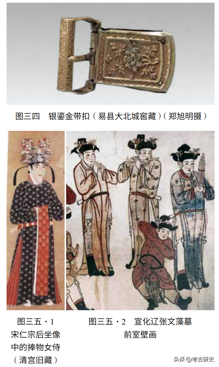 (六)带具。银鎏金菩萨献香花带銙二十枚(图三三),另有带扣两对,带卡两枚。带扣形制相同,惟纹样细节微异,当有一对与带銙构成一副完整的双䤩尾式革带。其中一对,带扣其表打作鱼子地上的折枝牡丹,装饰框外以毬路纹缘边,与扣舌相对的边框上下各錾花叶,窄边一溜毬路纹,宽边为龙牙蕙草(图三四)。另一对,其他均同,惟宽边錾方胜。带銙二十枚:方銙十,圆桃銙八,䤩尾一对。带銙的装饰面设在立墙中间稍稍偏上的部位,与带扣相同,双钩出来的装饰框外也是以毬路纹缘边,鱼子地上錾莲花、草叶,又犀角、象牙、金锭、银铤、宝珠、古禄钱等杂宝。方銙上五个献香花菩萨,头顶束高髻,下方覆披巾,衣袖和裤脚都是外翻荷叶边,个个俯首低眉,其中一人打着曲柄伞,伞两边各飘一朵流云,此外四人捧盘,盘上一个莲苞,惟方銙中的一枚菩萨手里捧的是香盒。䤩尾也是大致相同的纹样,不过增至九人,左侧山石边的一个手持一柄鹤扇。方銙与䤩尾图案中的人物凸起如圆雕,好像正从画面里走出来。原来它的制作方法有些特别,即在打制地纹的时候预留出插入人物的孔眼,人物另外以片材打制成型,从孔眼穿出,复在背面翻边,然后焊牢。圆桃銙则只是片材一枚,人物便从背面打制而成。带銙背面的银条原用于固定带板,今银条之端仍是固定带板之后砸扁的样子,可以推知窖藏之际带銙是依次从带板上卸下来的。双䤩尾式革带通行于辽和宋,颇见于各类图像,如宋仁宗后坐像中两侧的捧物女侍(图三五·1),如宣化辽墓壁画中的侍从和伎乐[6](图三五·2)。