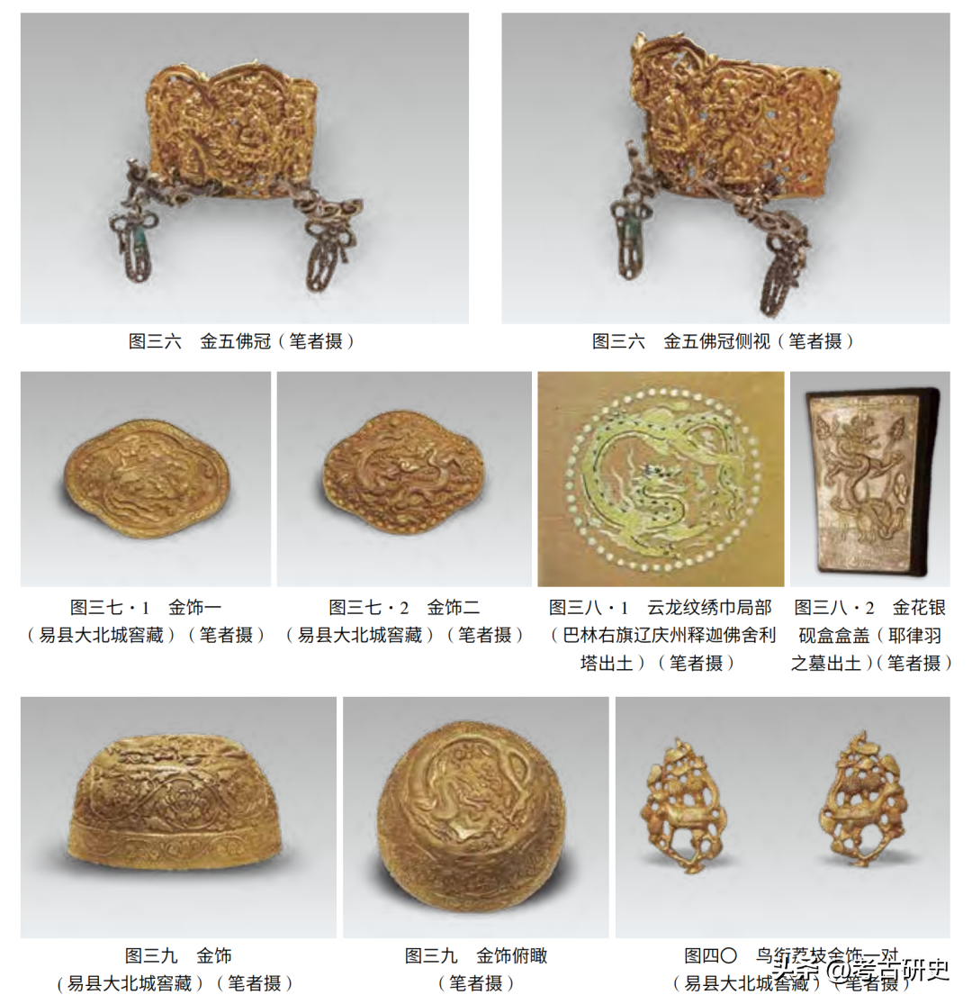 (3)造型略如覆钵的一件金饰,高3.8、口径7.6厘米,不明用途,惟见制作精好。连珠纹三道把器身分作鱼子地上的三个装饰区域:第一重环以龙牙蕙草,第二重缠枝牡丹,顶端蟠龙戏珠,空白处两朵流云(图三九)。
