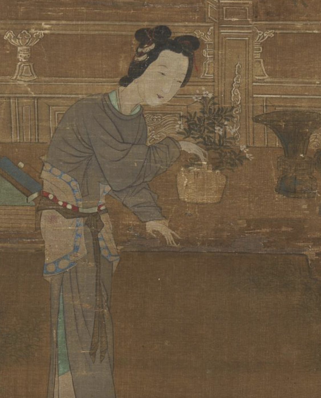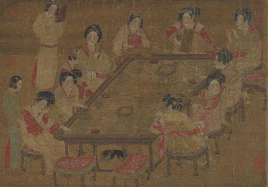 此图旧传为唐人画作,但据其谨细缜密的画风和图中所陈设的器物的造型、装饰等,当出自南宋画院画家之手笔。
