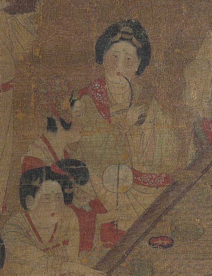 此图是一幅工笔重彩仕女画,表现的是贵族女子各执乐器,在殿宇前的地毯上配乐演奏的情景。周围站立三位女子,或侧耳倾听,或低声言谈,巧妙地营造出“听”的动感氛围。通过此图可见贵族女性在演奏时愉悦的心境,以及她们闲适高雅的游乐生活状态。
