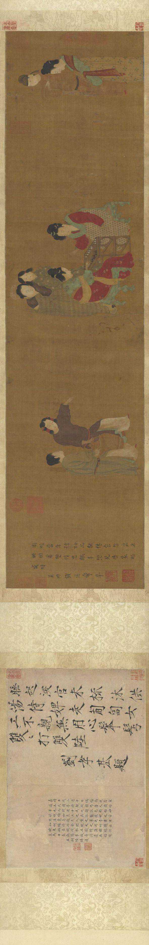 此图旧签题以及对幅耿昭忠的题记均言作者是五代周文矩。周文矩受南唐后主李煜颤笔书法的影响,喜以瘦挺颤掣的笔法入画,线条多转折顿挫,刚中有柔。此图线条工谨精细,如春蚕吐丝,柔中见刚,与周文矩的用笔特点不符,因此,它应是宋代佚名画家所作。