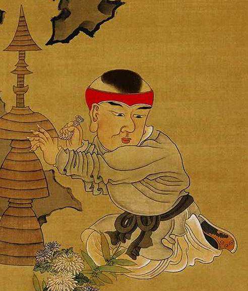 《童子礼佛图》轴,明,陈洪绶绘,绢本,设色,纵150cm,横67.3cm,现藏北京故宫博物院。