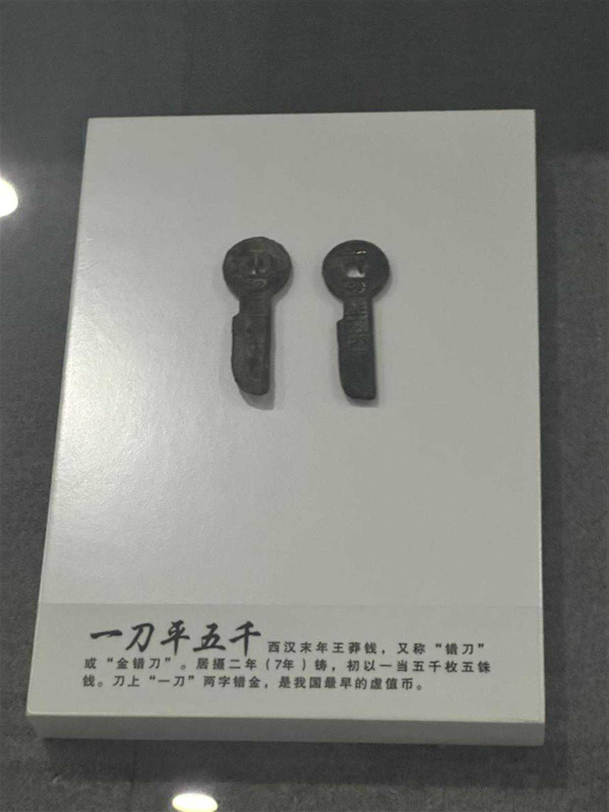 “金色的光就是钱币上用黄金填刻上去的‘一刀’两个字。”任珊曼介绍,“一刀平五千”是中国最早使用,而且也是唯一用错金工艺制成的钱币。于新莽年代制造,主要材料是金属,分为环柄和刀身两部分。又称“错刀”或“金错刀”,也是我国最早的虚值币。“一刀平五千”的字为阴刻,字陷处填以黄金,并且加以打磨,使字面与钱面平齐。刀身上铸有阴文“平五千”三字,其中“平”是“值”的意思,即表示一枚刀币价值等于五千。
