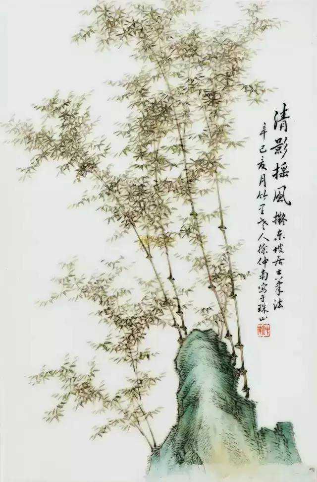 (徐仲南粉彩竹石图诗文四方笔筒1938年作)
