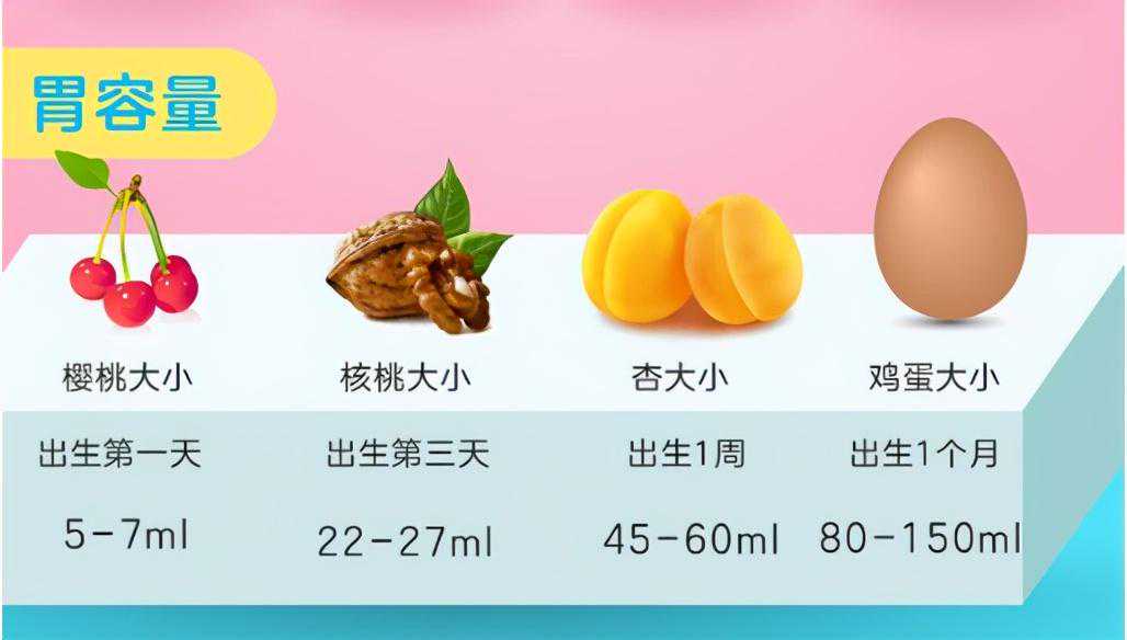 满月的宝宝要怎么喂养宝宝出生时,胃容量几乎只有樱桃大小,只能吃5-7毫升的奶。随着宝宝生长发育,吃奶量也会有很大变化。