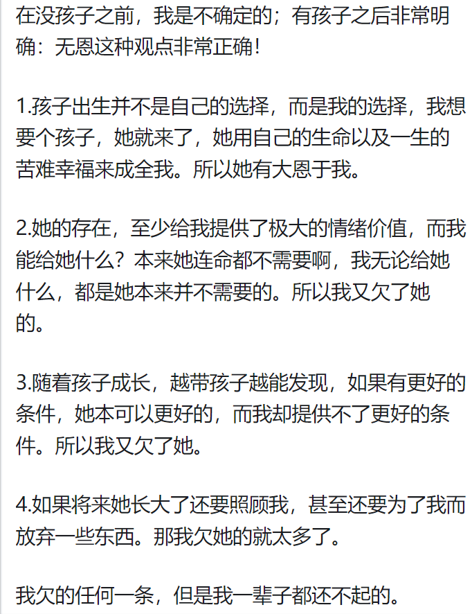 父母无恩论是正确的,是你自愿的,又不是孩子逼你,孩子生下来养大是应该的,这是父母的责任。老了她也要照顾你,这也是责任,如果你小时候没给爱,老了也别要求那么多看是做子女还是做父母,两种身份是不一样的。做子女记着父母的养育之恩,做父母时,都是应该的。如果反过来想就没意思了一地鸡毛。惯性思维,孩子如同白纸,你怎么涂,他就什么样。他们也是他们父母这么教过来的。对此,大家怎么看呢?