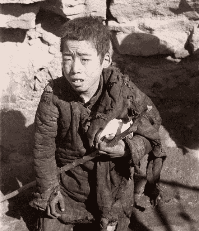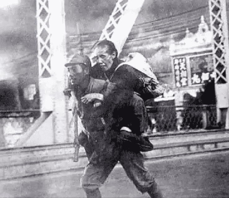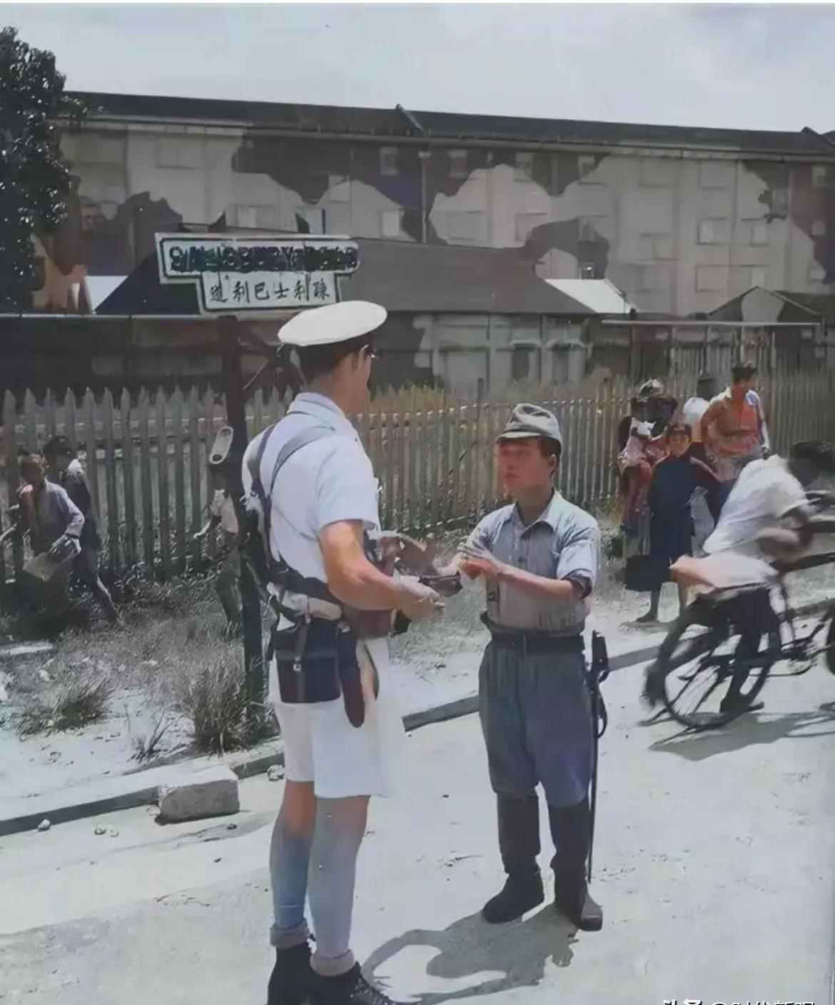 在1945年的香港街头,一名身高不足1.5米的日本士兵正在向英国士兵投降。