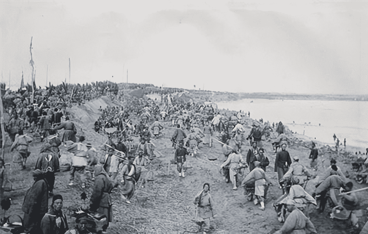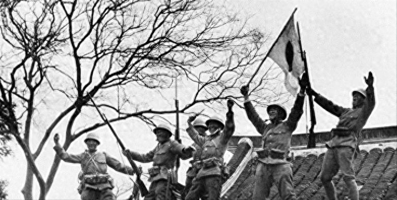 此时的日军手举倭旗,庆祝他们的无耻侵略。