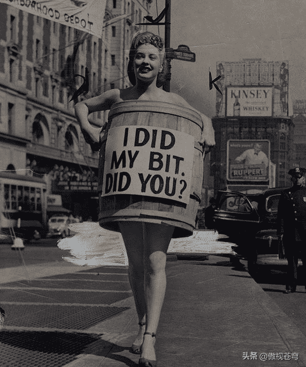 一名妇女戴上一个桶,以鼓励人们为国家服装收藏馆捐赠衣物,这样的举动旨在帮助饱受战争蹂躏的欧洲穷人的救援行动。
