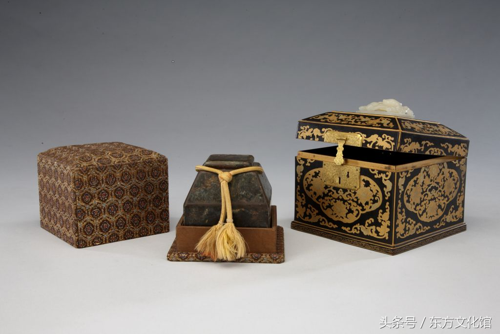 “同道堂、御赏”玺,清咸丰,二方一组,共装于一黑漆盒内。其中“同道堂”玺,青田石质,光素,篆书。面2cm见方,通高8cm。“御赏”玺,田黄石质,光素,篆书。面宽1cm,长2cm,通高5cm。