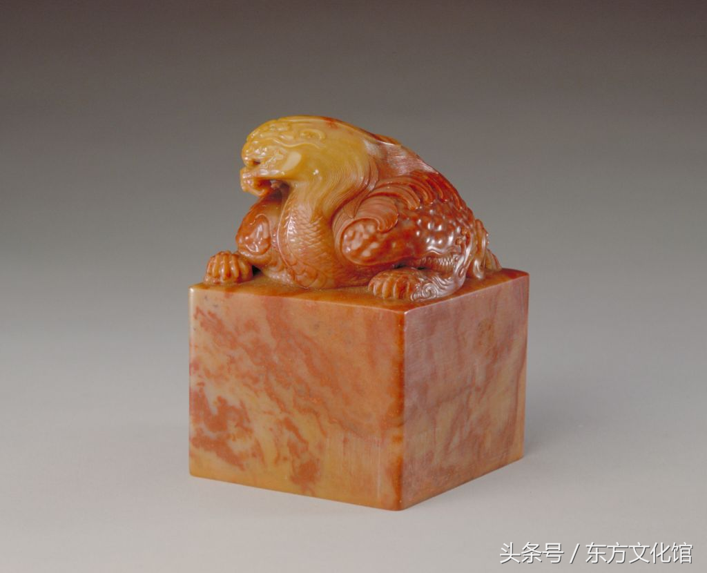 “乾隆敕命之宝”,清乾隆,寿山石质,螭纽方形玺,汉文篆书。面13.3cm见方,通高13.4cm,纽高5cm。