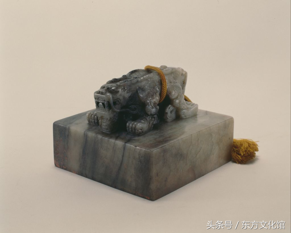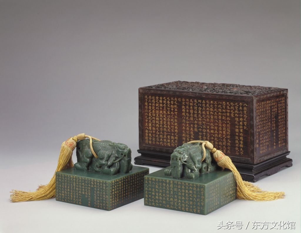 同治帝宝玺。此宝用一块水晶雕制,尤其是桥纽及连环,雕刻难度很大,不易成型,故十分难得。此宝曾钤于慈安皇太后、慈禧太后《行乐图》以及咸丰帝定陵神道碑之上。