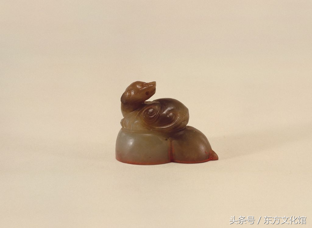 “保泰持盈”玺,清嘉庆,青玉质,瑞兽纽葫芦形玺,汉文篆书。面宽2.4cm,长4.1cm,通高3.1cm,纽高1.9cm。