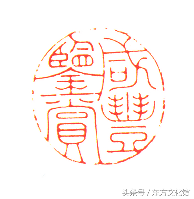 此种圆形“××鉴赏”玺的刻制始于乾隆帝,以后历朝皇帝皆有仿制,主要钤盖于内府收藏书画。咸丰帝此玺的印纽雕工为清早期寿山石印纽的风格,应是利用旧玺改刻的。