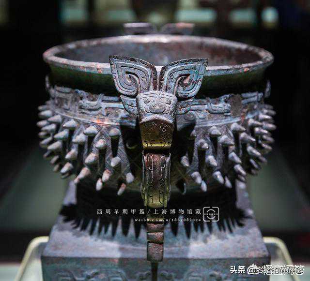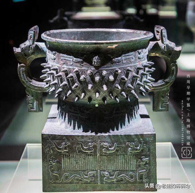 2018.10.11,笔者在上博青铜馆寻得了它,近观之,其上器侈口,深腹,圈足,上附方座。腹部两侧有兽耳垂珥,颈圈足饰鸟纹,腹饰乳钉雷纹。座的每一面各饰鸷鸟、长冠鸟和长尾鸟等。座面四角饰牛首纹。腹内底铭一甲字,据考证为器主之名。实属西周早期精美的国之重器,其价值不可估量,于是实拍之于各位分享,您上眼
