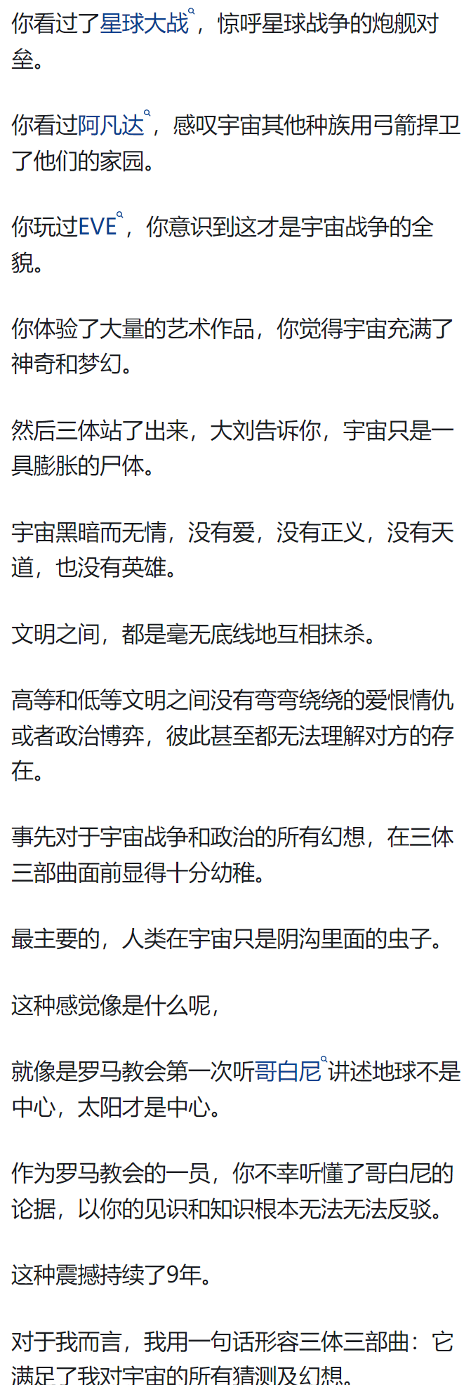 三体三部曲里的文明之间的战争才是宇宙战争该有的级别。人家都超光速怼你脸上了,居然跟你玩枪战。这种情节在《三体》出来之后,就显得极为幼稚了。看到黑暗森林,逃亡舰队在内讧之前的那一段,真的是惊心动魄,深深感觉大刘简直是挥金如土,如果浪费是罪,那大刘简直罪大恶极,这种文明剧变的情节,大刘只用了很短的篇幅就写完了,完全可以扩充很多万字的。超过理解的事物就是套娃了,无非换了一个名词,可以理解的情况下面对那种无力感才是真的绝望,这种绝望带来的思维震撼是享受级的。