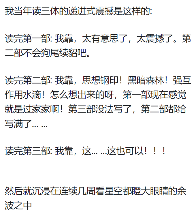 这么说吧,三体小说,直接摧毁了好莱坞式大片的影响。从根本上否定了美式科幻大片大场面的意义说实话,我看到水滴的时候,西方的科幻在我眼里就是下乘了,原来还有如此朴实无华的星际级武器。二向箔什么的往后稍稍。我看完第一部感觉是不错顶级水准,看完第二部是震撼+舒服像喝酒喝到微醺,看完第三部感觉是难过为自己的渺小悲哀。这得感谢误诊大刘的医生,让大刘误以为自己命不久矣,有多少存货不赶紧抖落干净怕要带进棺材了,写完了发现误诊,悔之晚以前看各种科幻小说科幻影视,我都觉得很合情合理,把外星人换成其他国家剧情也成立,只有三体,才让我觉得这才是真的外星人都看到这儿了
