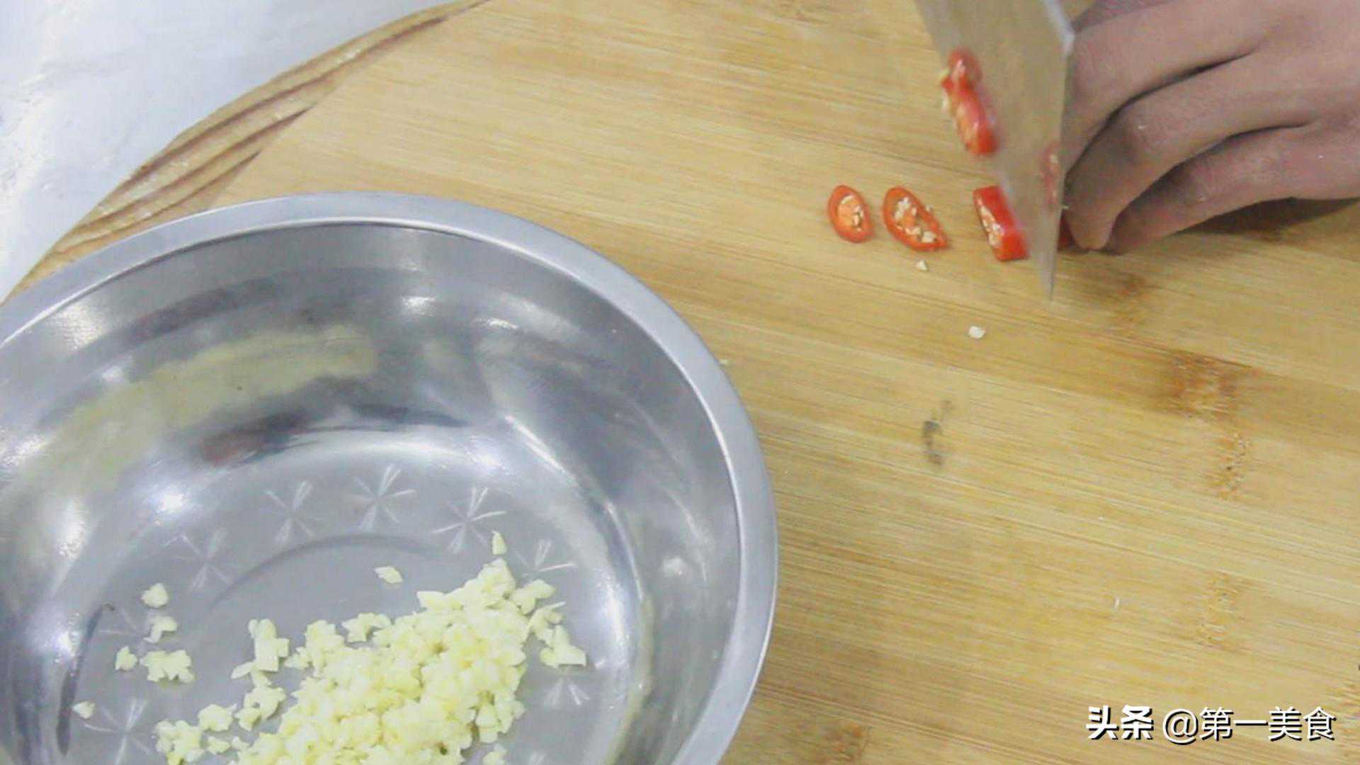 蒜拍扁,切成碎末,新鲜红椒,切碎,放入碗中。