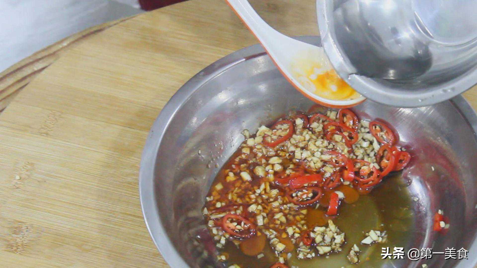 碗中放入食盐、白糖、陈醋、生抽、红油,搅拌均匀,再加入少量开水,搅拌化开调料。