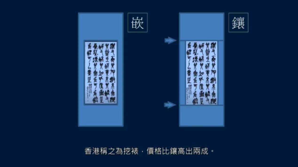 还有一种办法,就是用整张的料,中间挖出作品大小,然后把作品放进去,这称之为嵌,这样一来就没有接缝了。但很显然,这种办法比较费料,成本较贵。香港称之为挖裱,价格比镶高出两成。