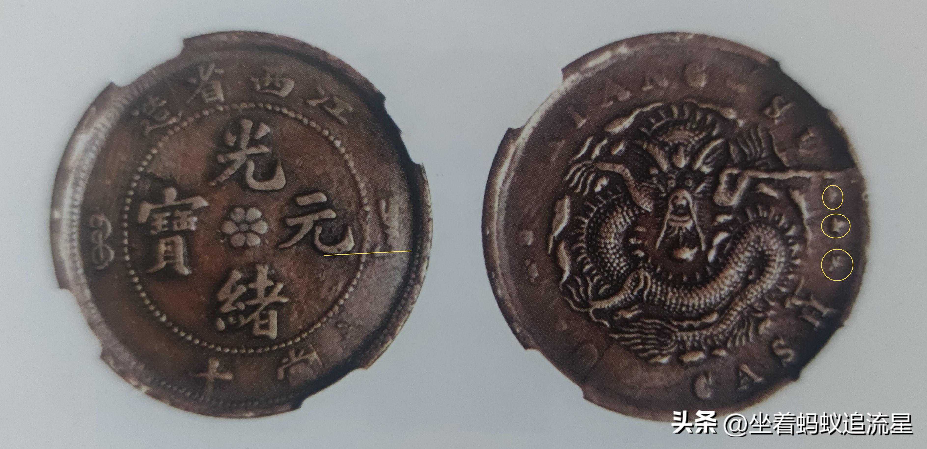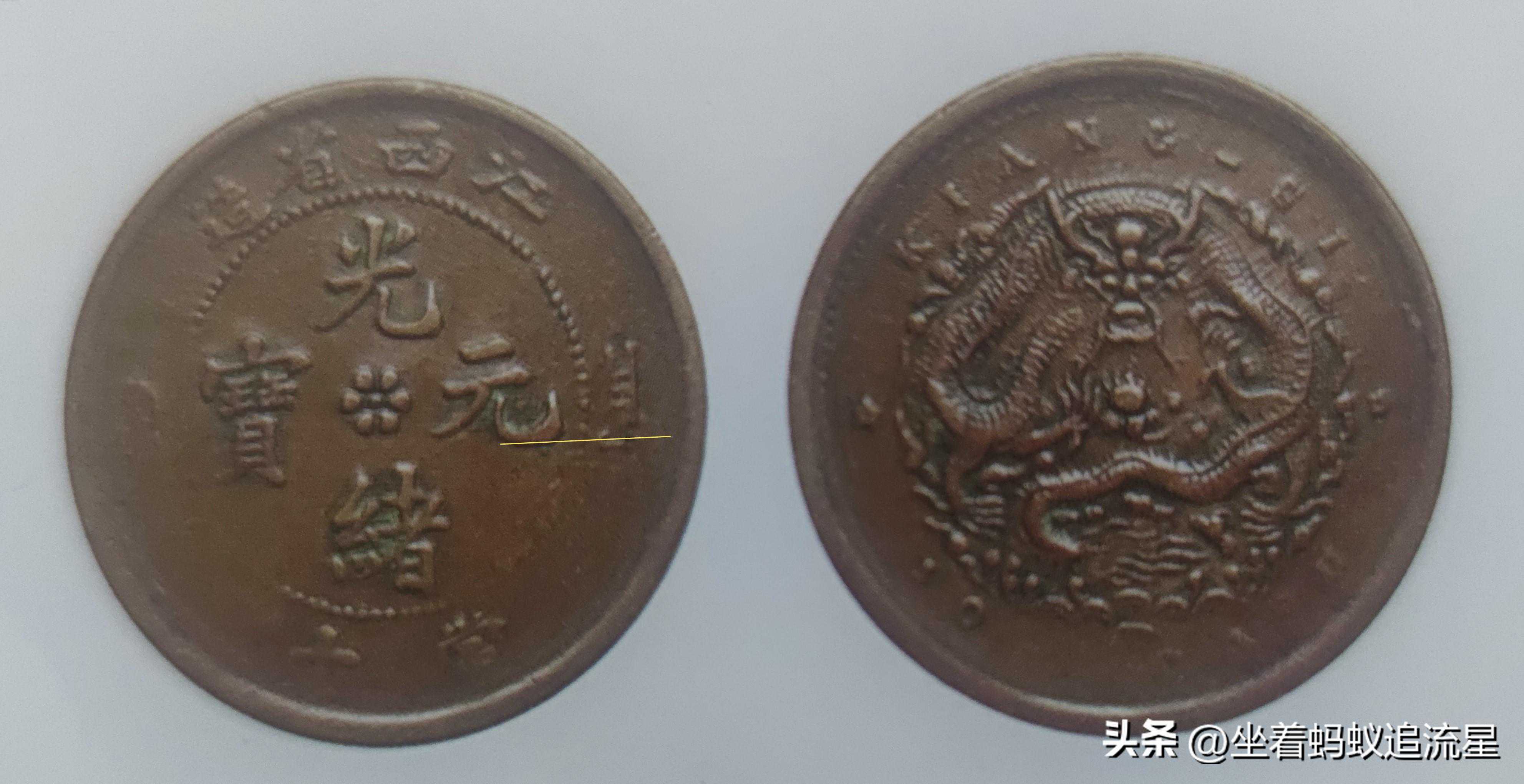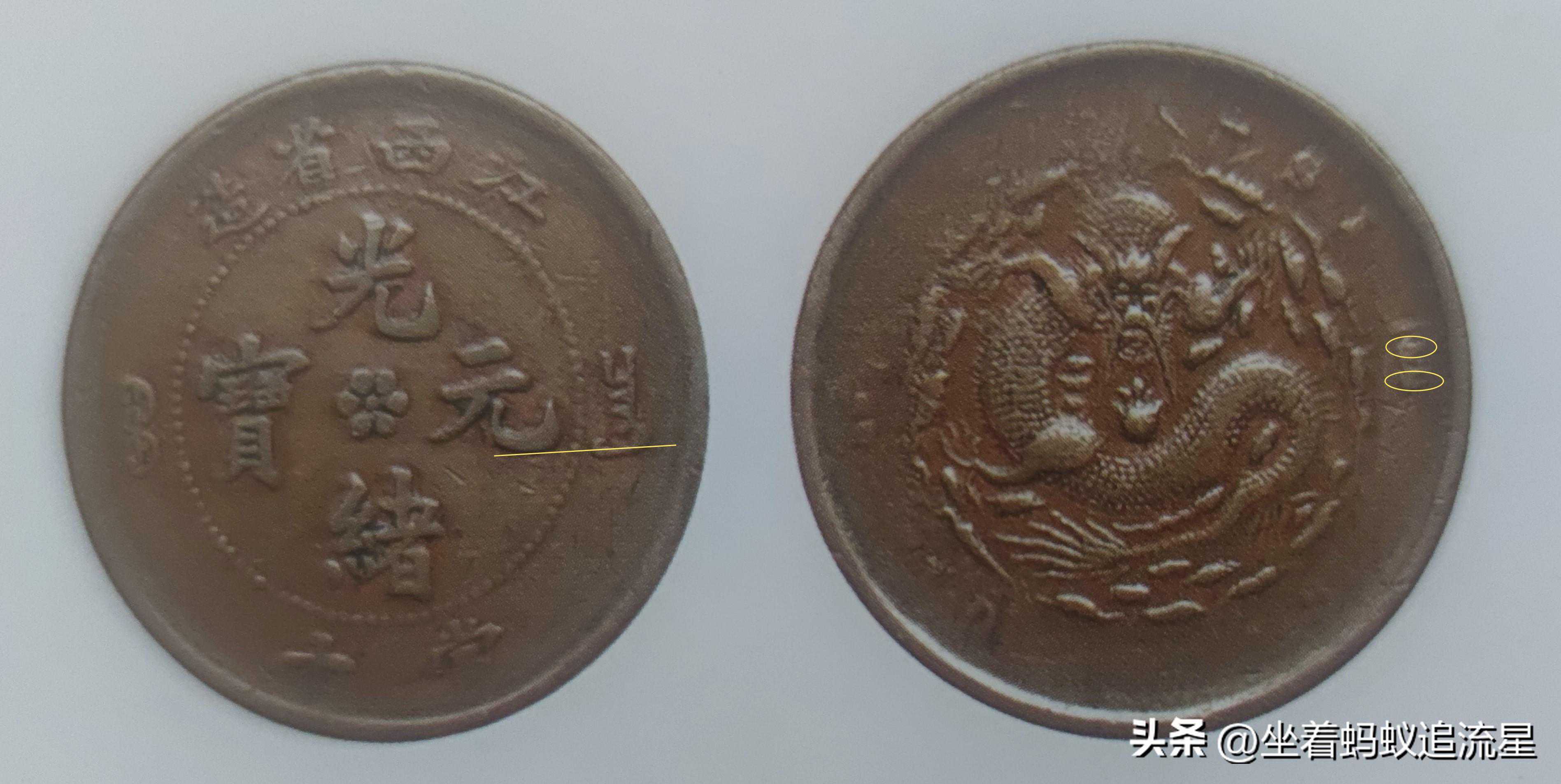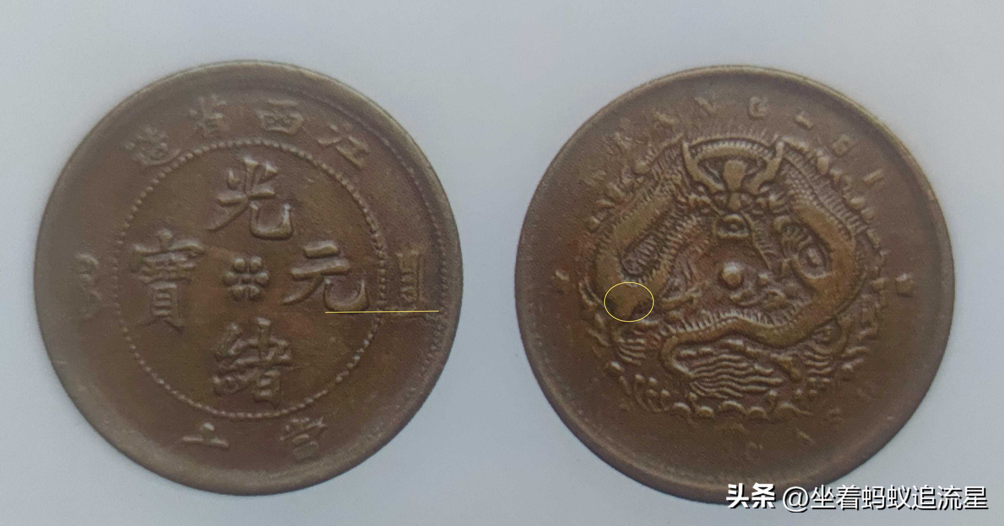 平脚昌低元反尾龙/8级(正面为:上缘铸“江西省造”,下缘铸“当十”,左右铸“满文宝昌”,中间铸“光绪元宝”四字。背面龙图为蛟龙,此版蛟龙的龙尾是向左,与正常蛟龙的龙尾刚好相反)