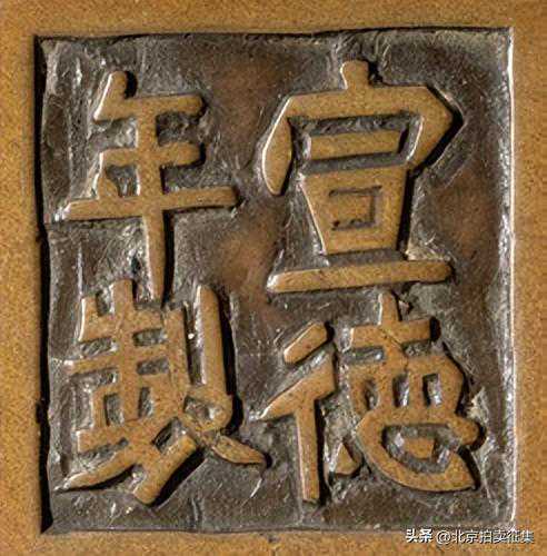 “宣德年制”四字篆书款,篆体略长,中规中矩,锋利而均称,结正而严谨,字面平整,款底明朗,是为官款也。炉身铜质金灿至极,壁薄适重,尤以音妙,同响器用材也。