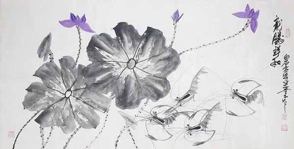 陶祥云用墨笔画荷花、荷叶水墨虾、蟹是人们所喜爱、所称赞的。