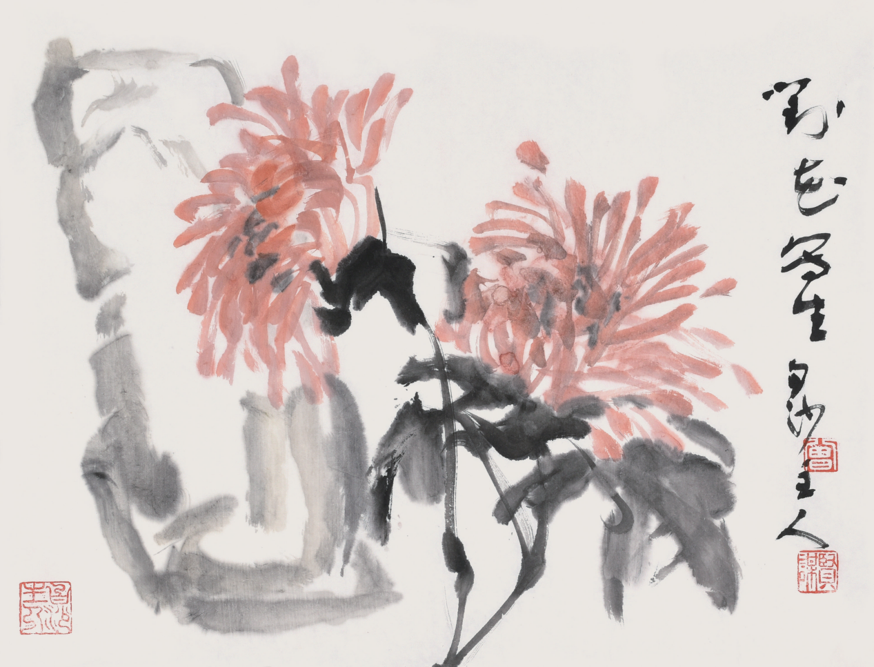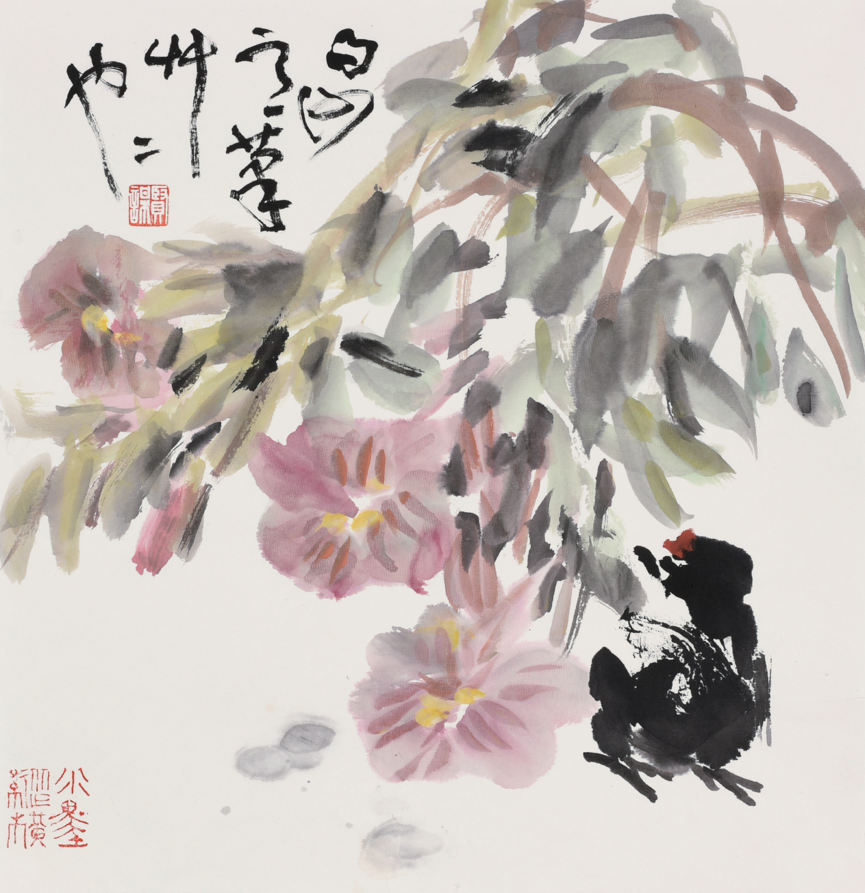 贤谋笔趣的轻重快慢、顿挫转揉的节律感,使他笔下的刺桐、蔷薇、月季、芙蓉、绣球、绿荷、牡丹,都在花瓣之间组合连缀中既见笔触,又天然吻合了花的姿情;既模糊了笔触之间、花瓣之间的界限,又使每一笔每一瓣不致游离孤立。模糊与清晰既强烈对比又贯穿融合的笔趣,给我们展现了一幅幅生机勃发的画卷。