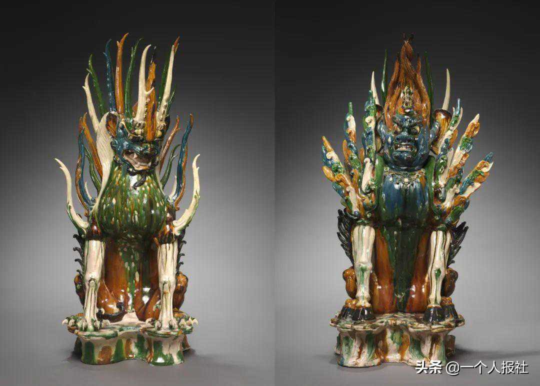 唐巩县窑三彩镇墓兽(对)
